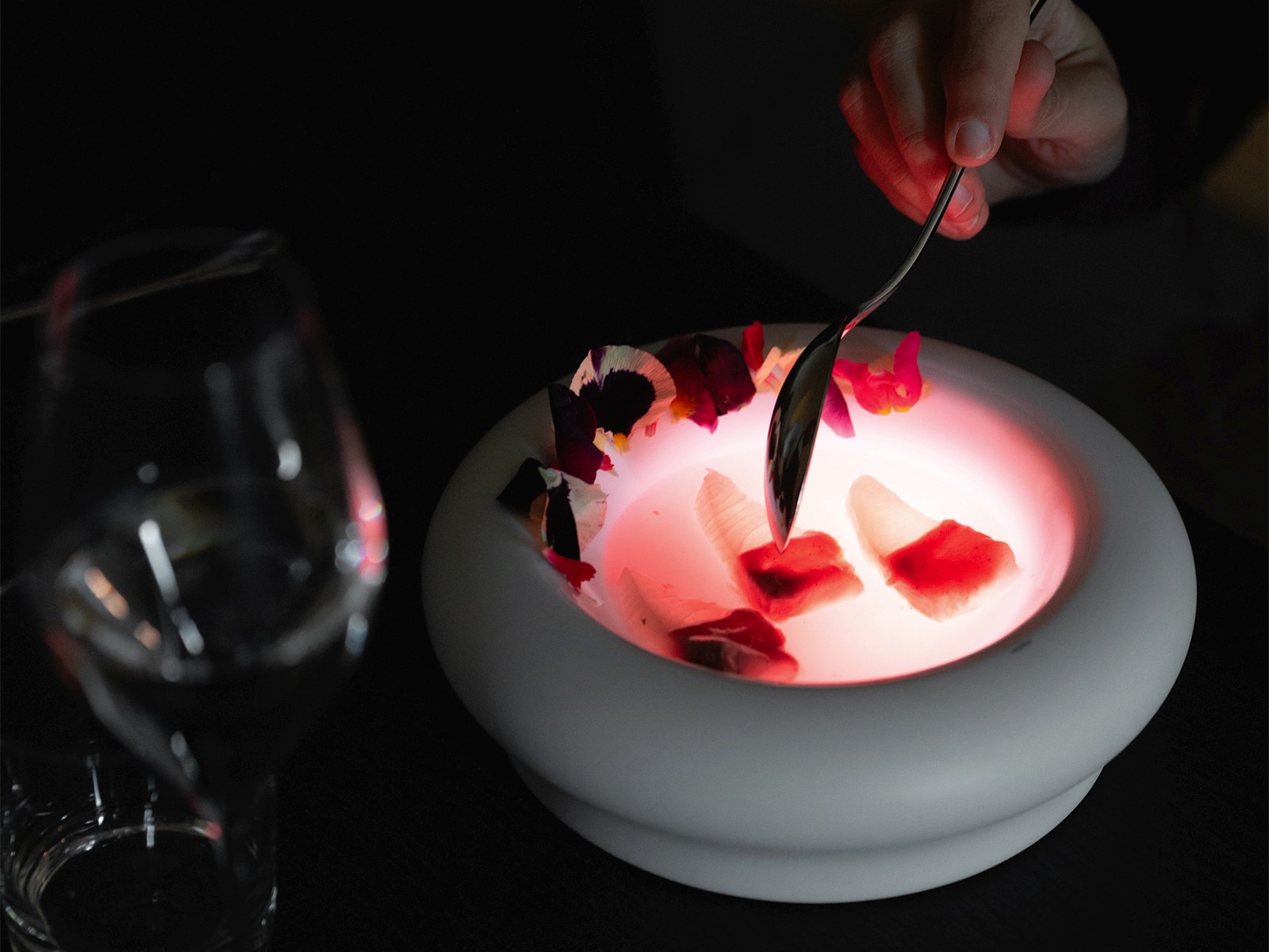 Plates and glasses react to movements and food, creating an immersive atmosphere that transforms the ritual of dining into a multisensory experience.